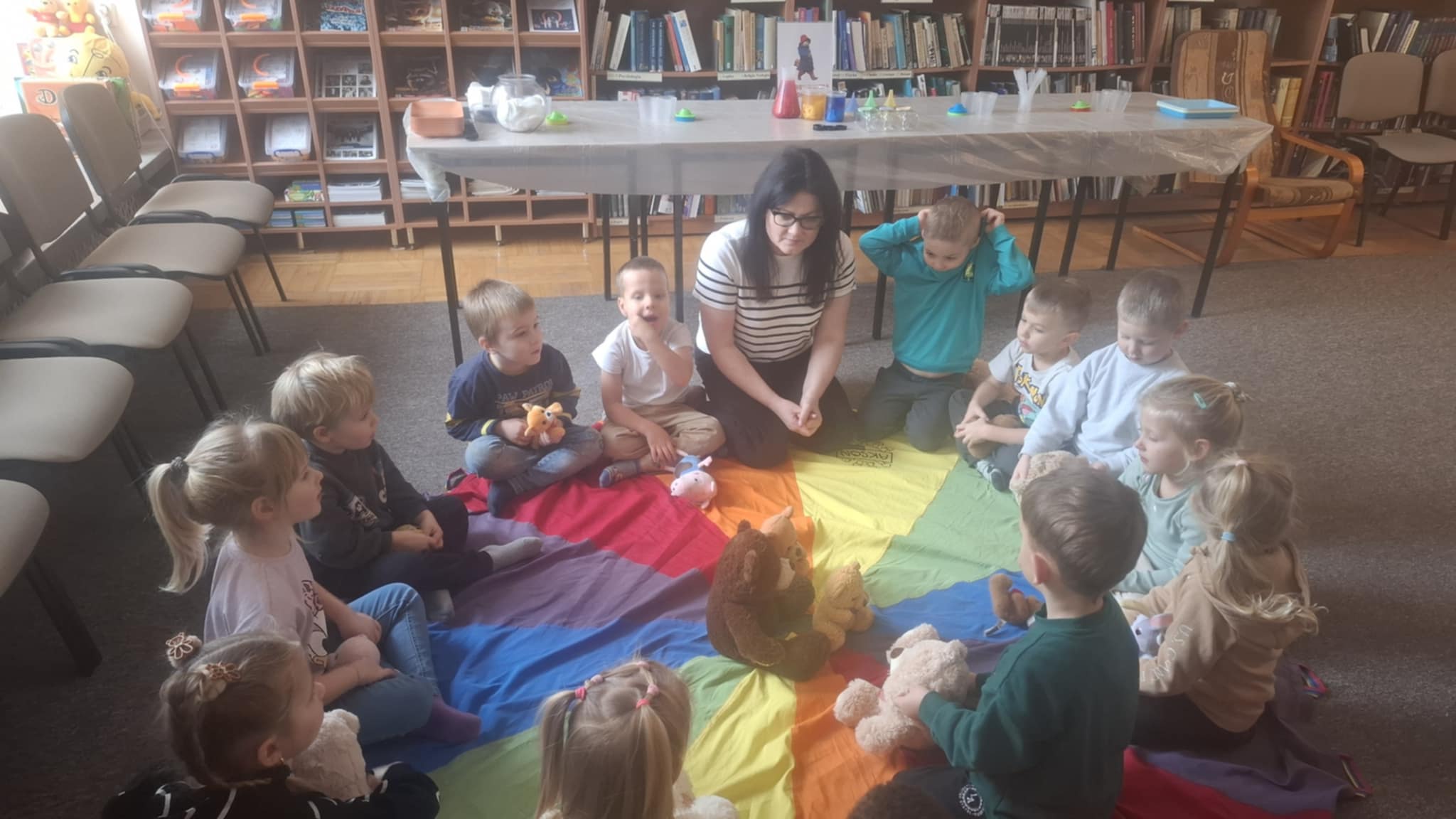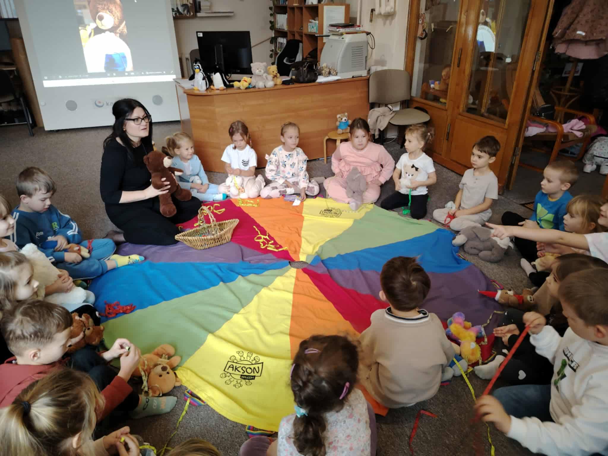 Podczas wizyty dzieci ze Szkoły Podstawowej w Goławinie oddaliśmy się słuchaniu opowieści o niesfornym misiu, która wprowadziła wszystkich w bajkowy nastrój. Potem kolorowa chusta animacyjna zamieniła bibliotekę w wirującą krainę zabawy i radości.