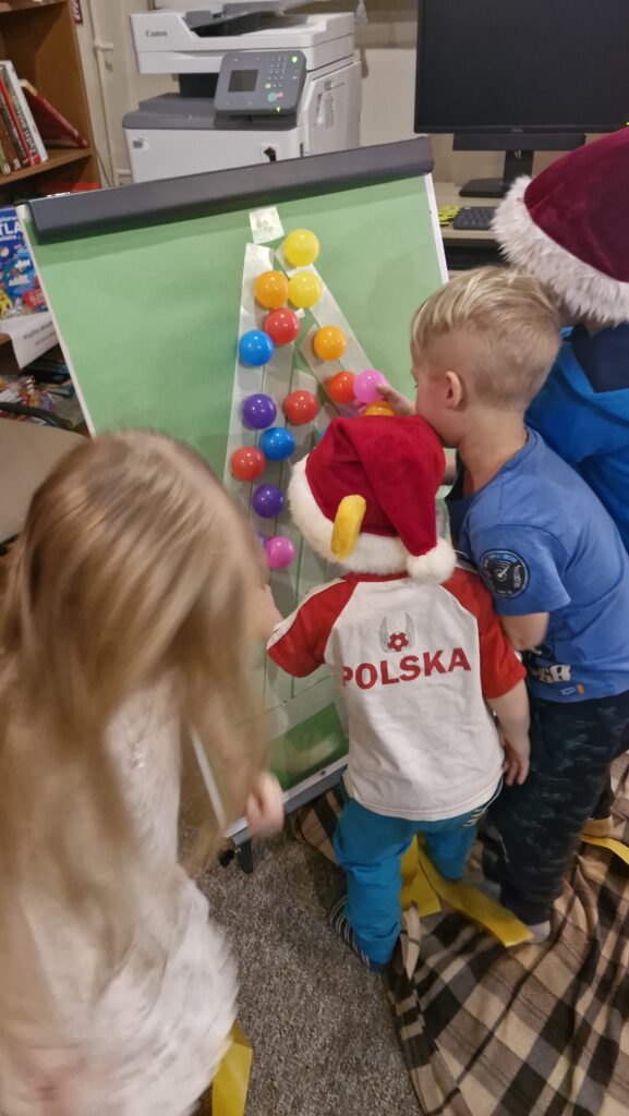 Czytaniu towarzyszyły kreatywne zabawy, które wprowadziły element ruchu i swobodnej ekspresji. Świąteczna rozgrzewka dodała energii, a wspólne aktywności integrowały uczestników i wywoływały wiele radości. Każde działanie było okazją do współpracy, wzajemnej pomocy i budowania relacji w rodzinnej, serdecznej atmosferze.