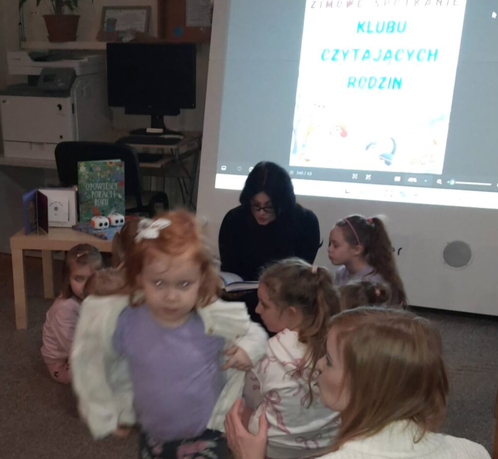 Dziś nasza biblioteka wypełniła się radosnym gwarem dzieci i rodziców, którzy licznie przybyli na kolejne spotkanie Klubu Czytających Rodzin. Od pierwszych chwil towarzyszyła nam prawdziwie zimowa, a jednocześnie bardzo ciepła i rodzinna atmosfera.