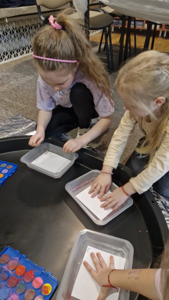 Później zrobiło się jeszcze bardziej zimowo i bardzo artystycznie. Podczas malowania po lodzie dzieci puściły wodze fantazji, tworząc barwne i niepowtarzalne dzieła zimowej sztuki. Takie aktywności wspierają rozwój kreatywności, samodzielności oraz uczą wyrażania emocji poprzez sztukę.