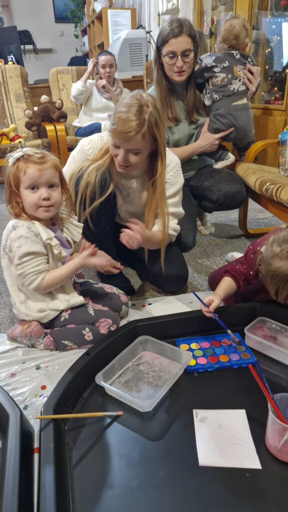 Wspólne spotkanie rozpoczęliśmy od czytania fragmentu książki „Zima Muminków”, który przeniósł nas w magiczny, śnieżny świat pełen wyobraźni i emocji. Wspólne czytanie to nie tylko przyjemność, ale także niezwykle ważny element rozwoju dziecka – wzbogaca słownictwo, rozwija wyobraźnię, uczy koncentracji i wzmacnia więź między dzieckiem a dorosłym. Oglądaliśmy również książki o kolorach i porach roku, które zachęcały dzieci do rozmów oraz dzielenia się własnymi spostrzeżeniami.